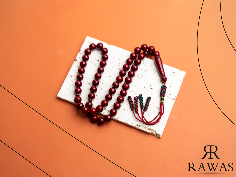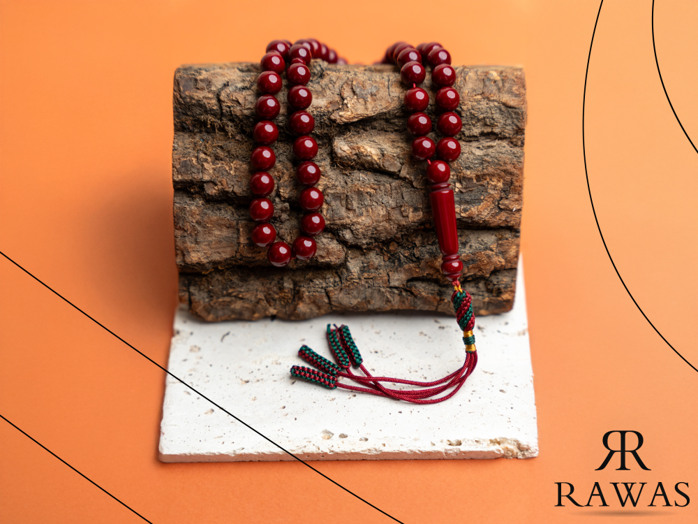 مسباح مصنوع من خرز بكلايت بلون عنابي داكن، يعطي لمعة واضحة ومظهر أنيق تحت الإضاءة.