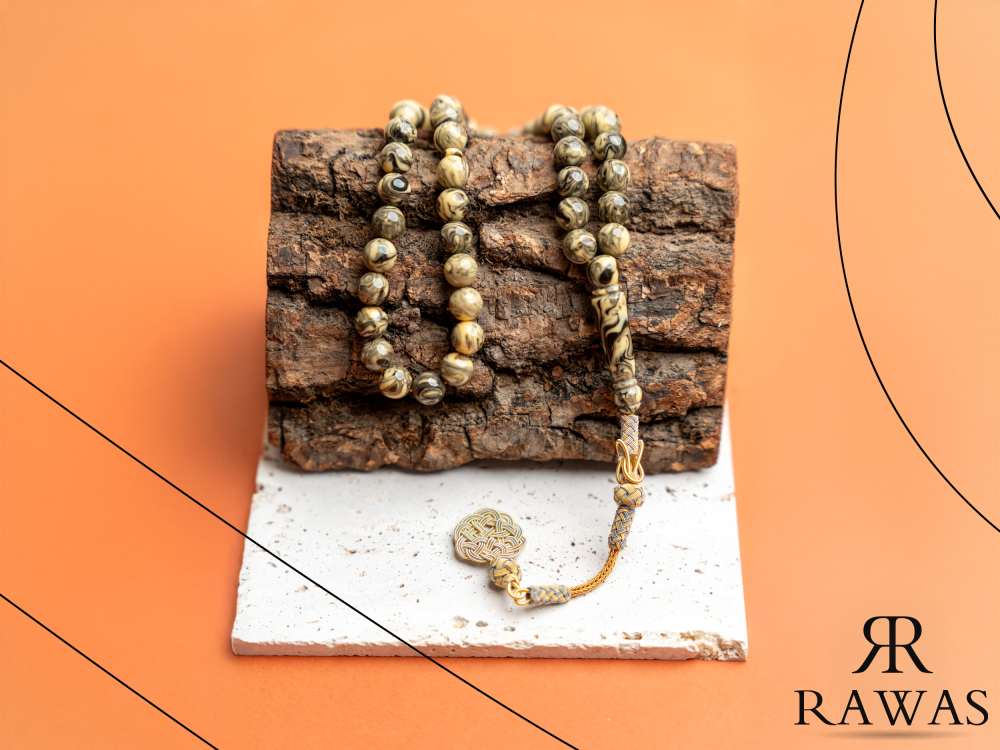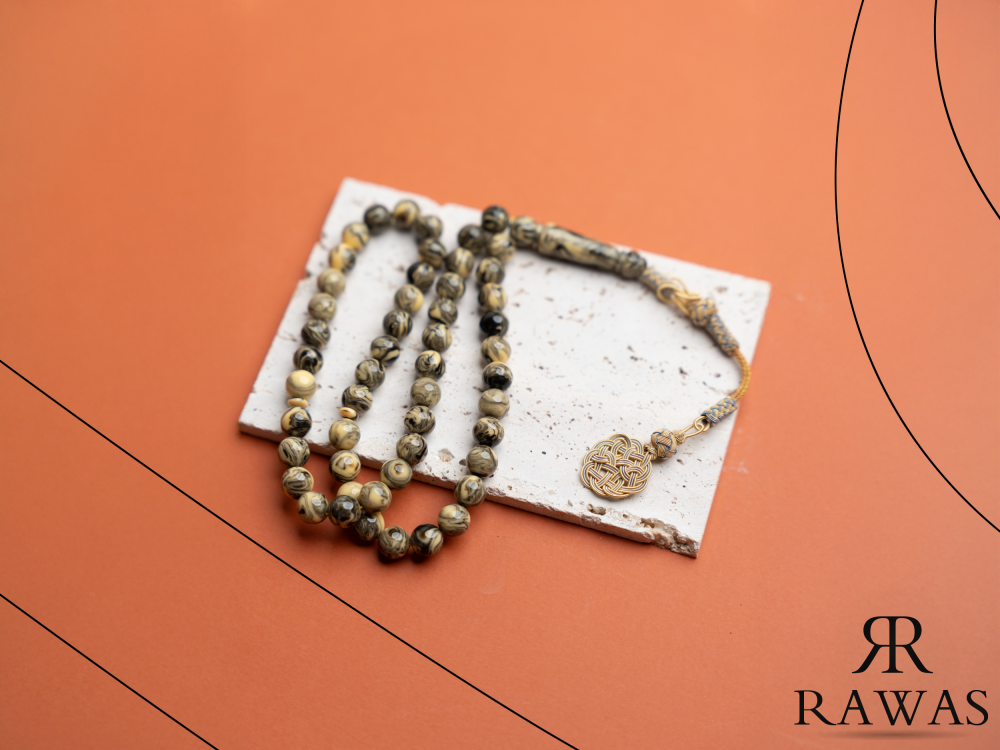 سبحة من خرز البكلايت بتدرجات رخامية رملية تمنح حضورًا طبيعيًا ولمعانًا راقيًا.