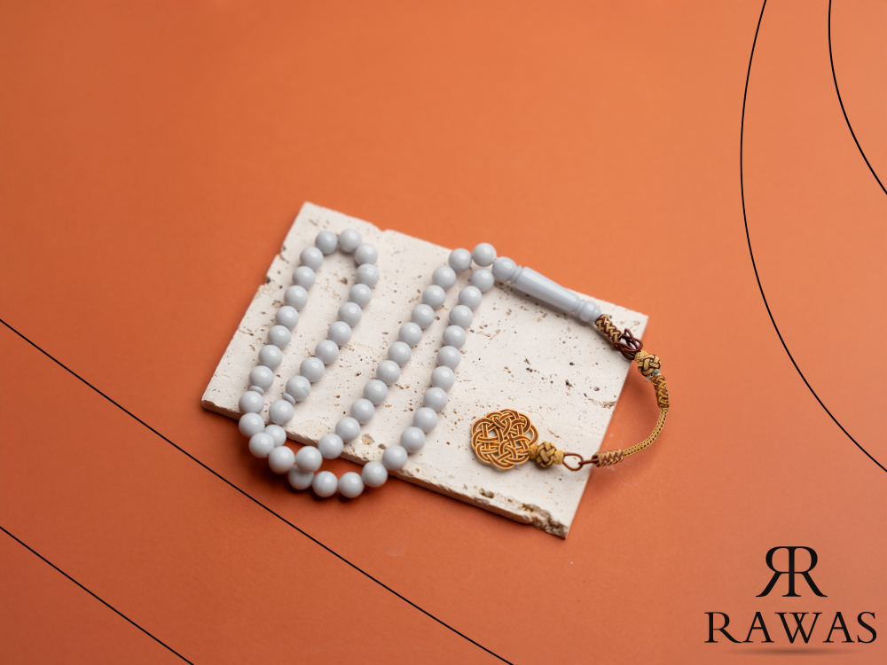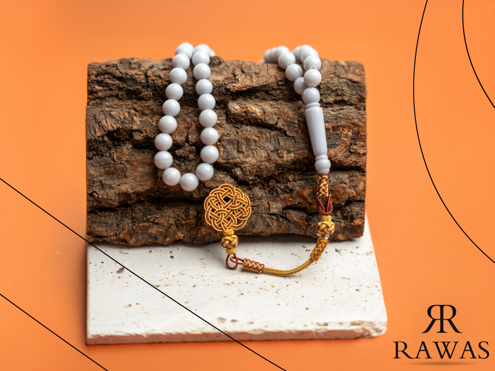 خرز ناعم بلون ابيض يمنح السبحة طابعًا هادئًا وأنيقًا، ينعكس عليه الضوء بلمعة خفيفة راقية.
