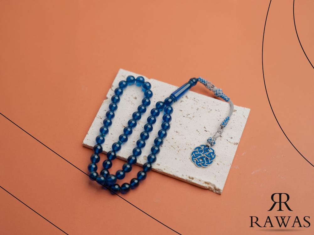 طربزونة مزيّنة بخيوط باللون الأزرق تُكمل لون المسباح.