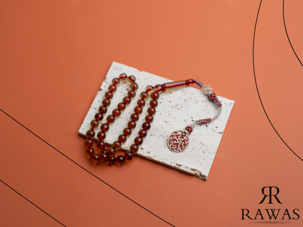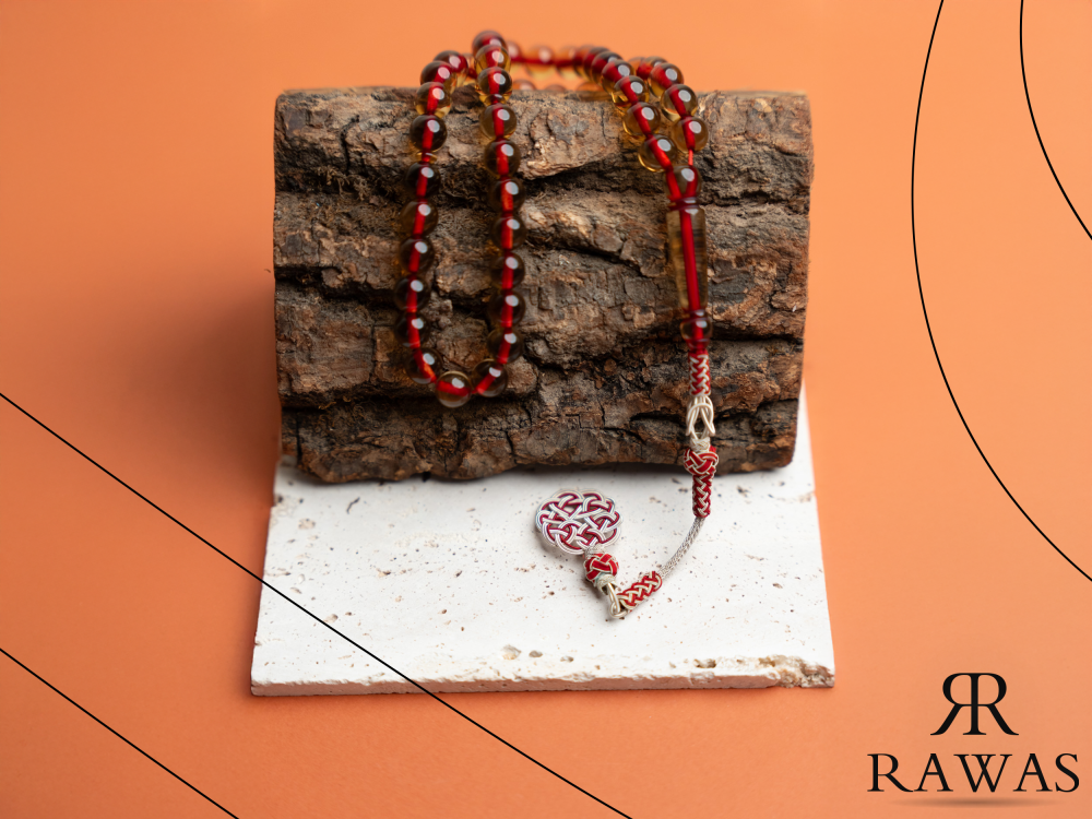 مسباح مصنوع من خرز بكلايت شفاف بلون أحمر فاتح، يبرز بلون لامع وجذّاب مع الإضاءة.